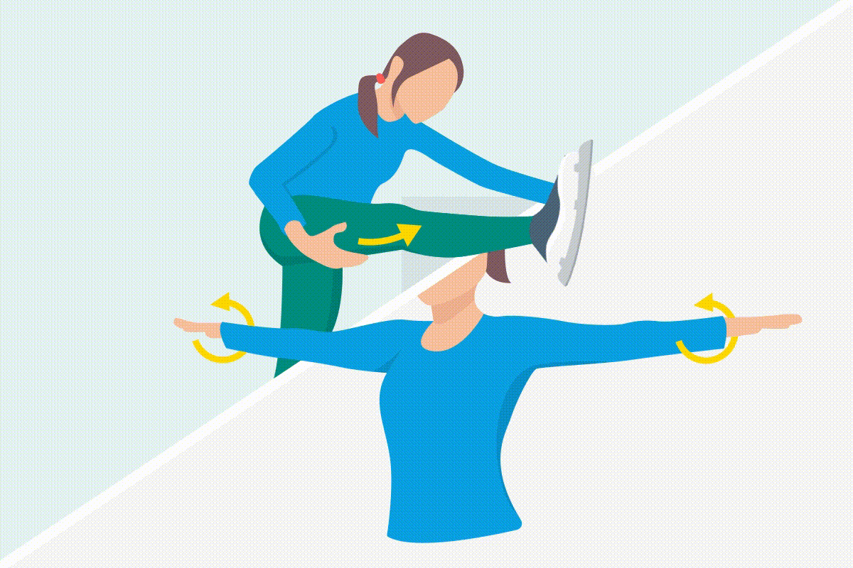 Eislaufen ist richtiger Sport, daher sollte ein zehnminütiges Warm-up nicht fehlen, um Muskeln, Sehnen und Gelenke aufzuwärmen und Verletzungen vorzubeugen. Also: Erst die Beine dehnen, dann den Oberkörper, die Arme erst nach oben, dann zur Seite strecken und in kleinen Kreisen bewegen.